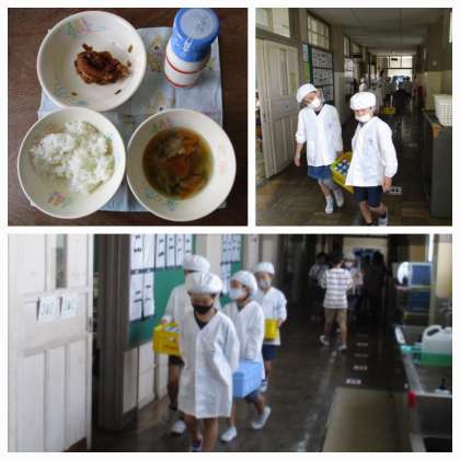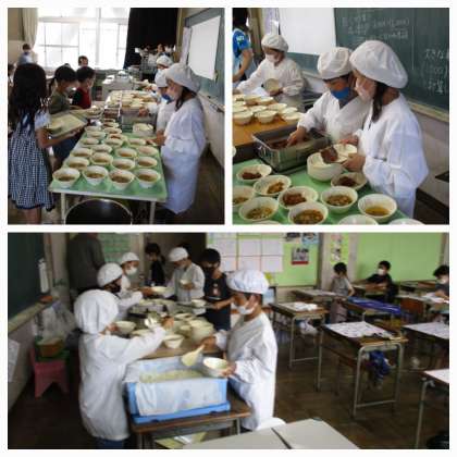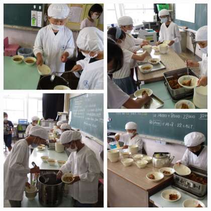 写真は、3年生の準備の様子です。大きいおかずの配膳は、2人で行います。お玉を二人で同時に使うとぶつかってしまいがちですが、写真のクラスでは、お椀につけ分け、つけたお椀を配膳台に置き・・・の動きを、二人が交互になるようにとてもリズムよく行っていました。お互いが、相手の子の動きに合わせていることがよくわかりました。