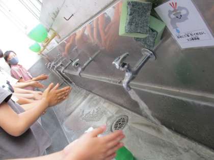 みなさんは、毎日朝に手を洗います。このようにして、コロナ感染対策をしています。他にもマスクをつけたり、給食の前には手の消毒をします。これらをすることで、神山っ子が毎日元気に来ることができます。