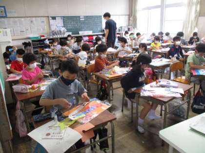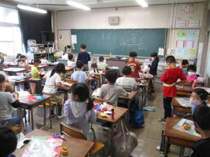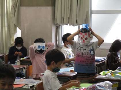 図工の授業で「わっかにへんしん」を作っています。飾り付けが進み、完成に近づいてきました。いよいよ装着してみて、確かめていきます。周りで装着が始まると、みんなキョロキョロ・・・。楽しい時間です。