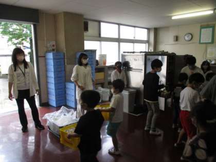 給食が終わると、コンテナ室への返却が始まります。全学級が1階のコンテナ室へ返すので、大混雑になりますが、出入りのルートが分けられ、スムーズに動けるように工夫されています。そして何より、給食委員さんたちの動きの機敏さのおかげで、あっという間に片付いていきます。荷物を各学級から受け取ると、驚くほどの手際の良さでコンテナの中に並べていきます。奥からきれいに並べるので、動きに無駄がなく、とても整然と片付いていきます。ご飯箱や牛乳箱もごみも、給食委員さんの手で、丁寧に片づけられていました。