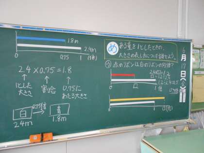 今日は、割合を表わす小数について学習しました。ある数をもとにすると何倍になっているか、小数を使って割合を表しました。数の大きさを比べて1より大きくなりそうか小さくなりそうかを予想したり、関係図をかいて数の関係を整理したりして、問題に取り組みました。