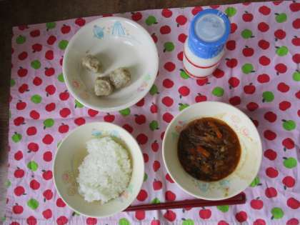 給食の時間が始まりました。今日の献立は、ご飯、牛乳、マーボー春雨、ポークしゅうまいです。マーボーといえば、マーボー豆腐が思い浮かぶかもしれませんが、今日は、マーボー春雨です。春雨のほかには、豚ひき肉、玉ねぎ、にんじん、長ねぎ、にらが入っています。マーボーは、辛いイメージがあるかもしれませんが、今日の給食ではトマトケチャップを使い、食べやすい味に仕上げました。