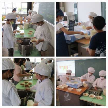 写真は、4年生の準備の様子です。マーボー春雨は、お玉ですくってお椀につけると、春雨がぴょんと飛び出てしまいます。当番の子たちは、きれいに配膳できるように、丁寧にもりつけていました。みんなで協力して準備を進め、今日も笑顔で「いただきます!」