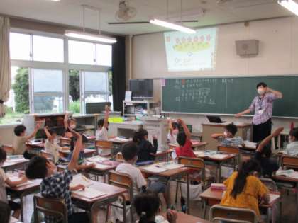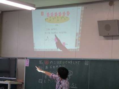 算数の授業で「ひき算」を学習しています。今日は、「のこりはいくつ?」に取り組みました。先生と一緒に1問目を考えます。「8個のあめがあって、3個食べると残りはいくつ?」の問題、さあどうする?」「−(ひく)」の記号を練習して、ノートに式を書きました。式が書けたら、計算をして、答えまでばっちり書けました。次は第2問!今度はお花の問題です。自分でどんどん式を書いて、答えを出しました。おっと〇個じゃなくて〇本でした。これもばっちりできていました。先生が不思議な方向に指をさしていますが、スクリーンの指の影は、ぴったりのところをさしていて、みんな、うんうんとうなずきながら先生のお話を聞いていました。
