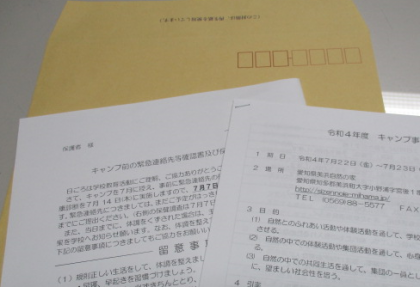 6/23 キャンプ説明会にご欠席された皆様へ 公開日 2022/06/23 更新日 2022/06/23 PTA 本日のキャンプ説明会の資料を入れた封筒をお子さんにお渡ししましたので、ご確認ください。何かご不明な点がございましたら、担任までお知らせください。よろしくお願いいたします。