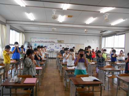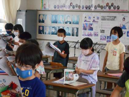 音楽の歌唱の前には、息を大きく吸ったり、顔の筋肉をほぐしたりして、美しい声が出るための体操をしています。しっかりと準備をした後、「こいのぼり」を歌いました。「タッカ」のリズムを意識して、曲の盛り上がりに気を付けて、美しい声で歌うことができました。