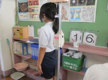 9/9 4年生 保健室で勉強しました! 公開日 2022/09/09 更新日 2022/09/09 4年生 今日は、保健室で保健の先生の授業がありました。「歯」について、スライドを使って学習しました。最初はクイズです。「人間と同じように1回だけ歯が生え変わる動物は何でしょう。」3択でしたが、予想外の答えでしたね。大人の歯が生え変わることはないので、歯磨きをしっかりして大切にしていきましょう。 そのあと、身体計測を行いました。身長伸びたかな〜。