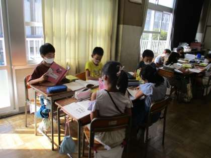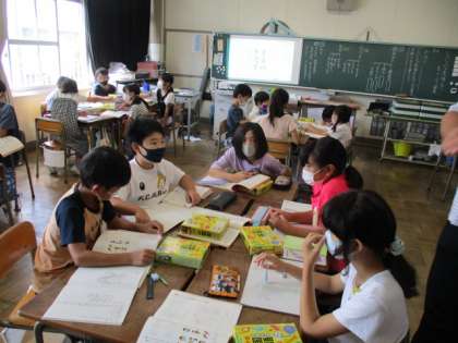国語の授業で「いろいろな意味をもつ言葉」を学習しています。「とる」のように、いろいろな意味を持っていて使い方もたくさんある言葉について、国語辞典で意味や使い方を調べました。調べたことをもとに詩を作ってみました。使う言葉は「ひく」「かける」です。頭をひねりながらノートに書き進めていました。最後にグループで発表し合いました。