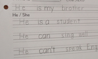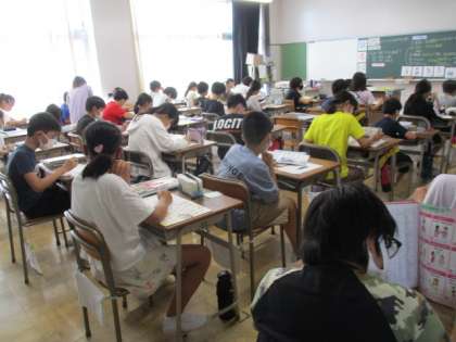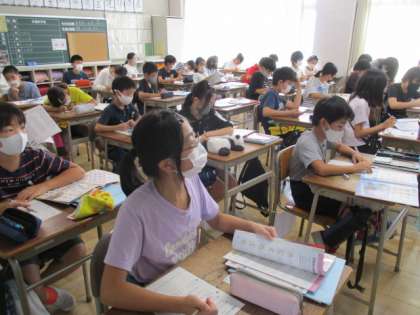 9/13 5年生 外国語 できること 公開日 2022/09/13 更新日 2022/09/13 5年生 外国語の授業で「身近な人を紹介しよう」をめあてに学習をしています。今日は、だれを紹介するかを決めて、その人の職業やできることを話す準備をしました。自分の身近な人なので、顔を思い浮かべながら考えていました。ゲームが上手、サッカーが上手、ピアノが上手、歌が上手、走るのが速いなど、表現もいろいろです。このあとの時間で、ペア対話や発表、紹介カード作成へと続きます。