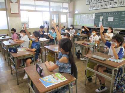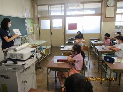 「What food do you like?」「I like 〜.」の表現を使って、好きな食べ物を聞いたり答えたりしました。リズムに乗って発音練習したり、ビンゴゲームをしたりして楽しみました。とても意欲的な3年生です!