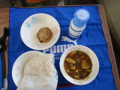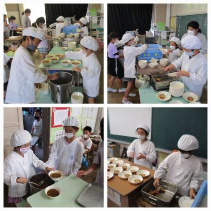 写真は3年生の準備の様子です。みんなで協力して、とても素早く準備が整いました。「いただきます」の段階になって、「しまった!」の声が・・・。「白い服を着てきちゃった」「カレーソフトめんの汁が飛び散らないように食べられるかな」