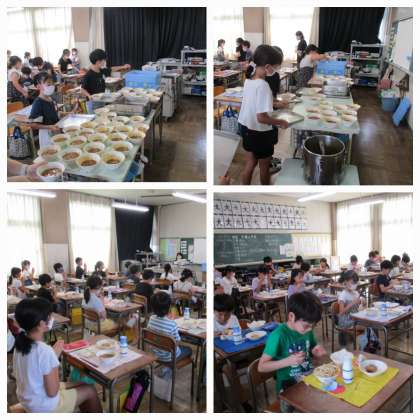 給食の時間が始まりました。今日の献立は、ソフトめん、牛乳、カレー南蛮ソフトめん(汁)、キャベツ入りつくねです。「南蛮」ということばは、とうがらしや長ねぎを用いた料理に使われることがあり、今日のカレー南蛮ソフトめんにも入っています。長ねぎは斜め切りにしているため、いつもの給食の汁物に入っている長ねぎとは違う形です。