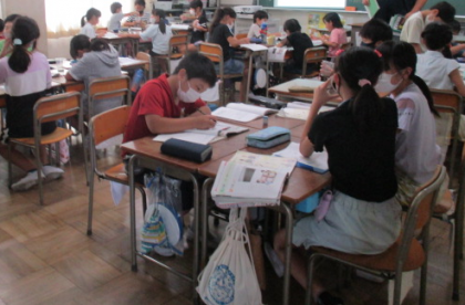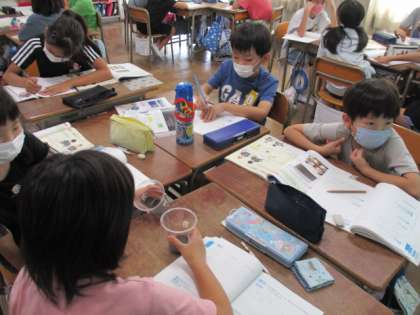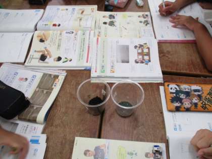 9/15 4年生 理科「雨水のゆくえ」 公開日 2022/09/15 更新日 2022/09/15 4年生 理科の授業で「雨水のゆくえ」を学習しています。今日は、「水は地面にしみこむのだろうか」を課題に、土と砂を入れたコップに水を注ぎ、実験をしました。手触りや水のしみ込み方など、分かったことを班で共有し、ノートにまとめていきました。普段外遊びなどで目にしている土ですが、比べてみると、粒の大きさがずいぶん違うことがよくわかりました。
