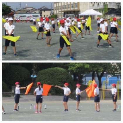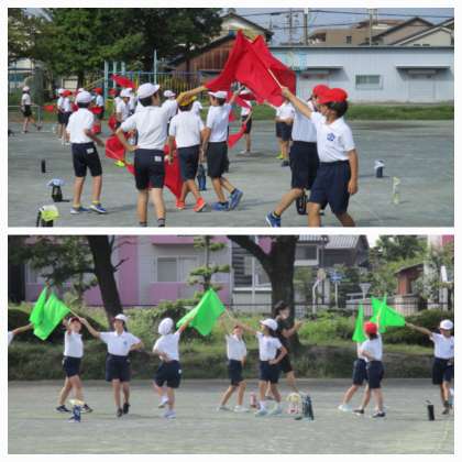 9/15 5年生 青空のもと5色映えて 公開日 2022/09/15 更新日 2022/09/15 5年生 運動場で体育祭の表現の練習をしました。旗の動かし方にも少しずつ慣れてきて、みんなで揃って動かしたり、数名チームごとの動きを練習したりしました。お互いに見合ってみると、「旗の高さをもっと上にした方がいい」「腕をぐっと伸ばすと大きく見える」など、改善するところがわかってきました。青空に5色の旗がはためいて、とてもきれいです。本番楽しみです。