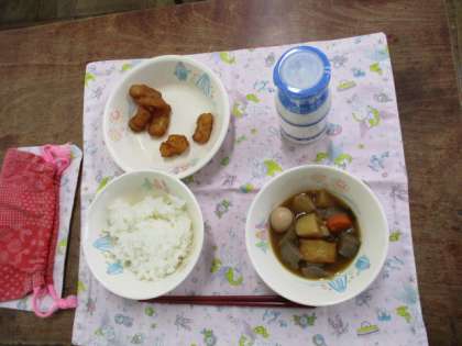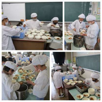 給食の時間が始まりました。今日の献立は、ご飯、牛乳、関東煮、いかの竜田揚げです。今日の関東煮には、さといもが入っています。さといもは、親いもの周りに子いもがたくさんできることから、昔から子孫繁栄を表す縁起の良い食べ物とされています。さといもは、エネルギーのもとになるでんぷんが多く含まれるだけでなく、食物せんいやビタミンも多く含まれています。