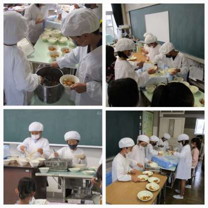 写真は3年生の準備の様子です。午前中の体育祭予行では、かっこいいソーランを表現することができました。チーム力が高まってきました。給食の準備もチーム力ばっちりで進めていました。昨日からかなり涼しくなり、おでんや関東煮がうれしい気候です。甘辛いいい匂いが食欲をそそります。