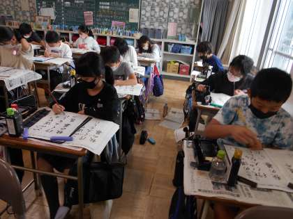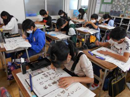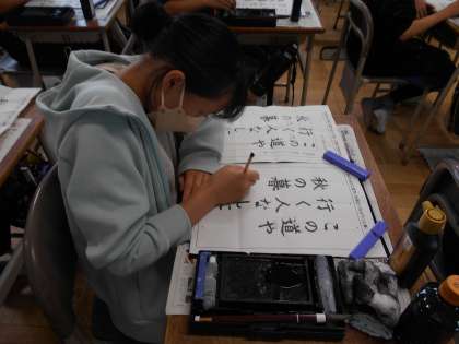 「この道や 行く人なしに 秋の暮」という、松尾芭蕉の句を、文字の大きさや配列などに気を付けて書く練習をしました。