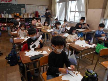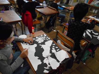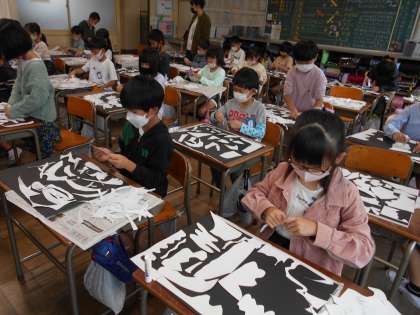 10/7 2年生 はさみのアート 公開日 2022/10/07 更新日 2022/10/07 2年生 図工で、「はさみのアート」という学習をしました。はさみを自由に動かして切った形を、紙の上に並べて貼ってつくる学習です。 はさみを、スイスイ、ジグザグ、グルグル、チョッキン!と、動かして、白い紙をたくさん切りました。切った紙を、黒い画用紙の上に並べると…「おお!アートだ!」。 なんだか、とってもいい感じです。 切るのも、貼るのも、出来上がった作品を見るのも、とっても楽しかったですね。