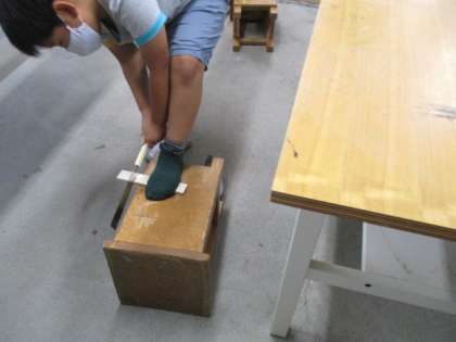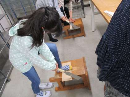 図工の授業で、「ギコギコトントンクリエーター」を作ります。「ギコギコ」は、のこぎりで切る音、「トントン」はくぎ打ちの音です。図工室から「ギコギコ」の音が聞こえてきました。のこぎりを使う基本をしっかり守って取り組んでいました。切る場所を定規できっちり線を引いたらいざスタート!足でしっかり押さえて、まっすぐ丁寧にのこぎりを動かしていきます。体にものすごい力を入れて作業をしているので、切り終わったときは達成感と安どの表情でした。切ったパーツをどのように組み立てていくのか想像しながら、全力で頑張っていました。