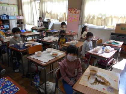 写真は、1年生の給食の準備の様子です。入学してから半年がたちました。給食の準備も、とても上手になりました。重い食缶を運ぶのも、たくさんの牛乳や箸を配るのも、全員の食器につけ分けるのも、自分たちで上手にできるようになりました。待っている子も、姿勢よく待つことができましたね。
