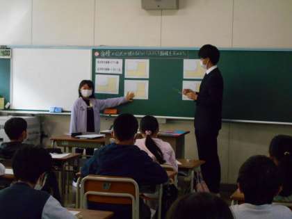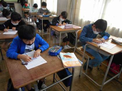 10/11 4年生 教育実習の先生と勉強 公開日 2022/10/11 更新日 2022/10/11 4年生 算数で「面積」の学習をしています。今日は、教育実習の先生に授業をしていただきました。何人もの先生が授業の様子を参観され、少しだけ緊張している様子の子どもたちでしたが、だんだん緊張がほぐれ、いつものように、積極的に授業に取り組むことができました。 複雑な形の面積を求める方法について考え、近くの席の友達と交流したり、発表したりできました。
