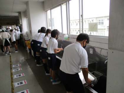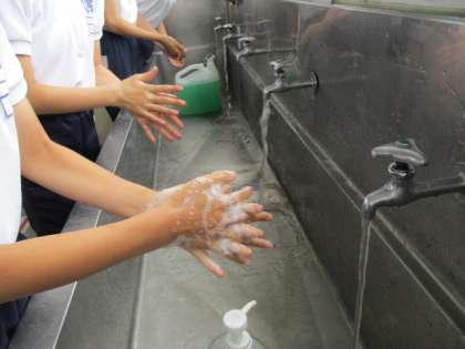 給食前の手洗いタイムです。午前中運動会だった子も、午後から運動会の子も、給食前の、「あわあわゴッシー」の手洗いタイムです。ぴかぴかの手になって、給食準備がんばります!