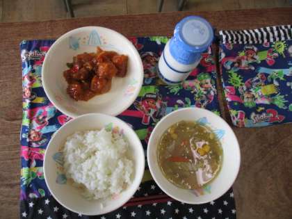 給食の時間が始まりました。今日の献立は、ご飯、牛乳、中華コーンスープ、酢豚です。酢豚は中華料理のひとつです。今日の給食の酢豚は、角切りにした豚肉を油で揚げて、玉ねぎ、ピーマン、赤パプリカなどの野菜を炒めています。そこに、トマトケチャップと酢、砂糖、しょうゆなどの調味料を入れて、味を調えて作りました。