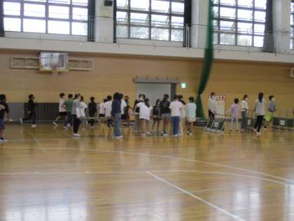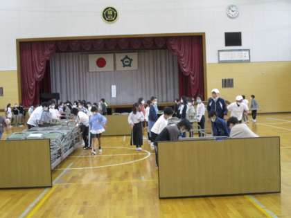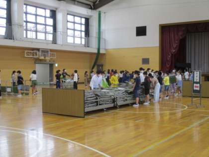 5年生の体育祭の締めくくりは、アリーナ内の片付けです。6年生がきれいにして運んでくれた3連椅子を、収納場所に片付ける仕事です。2人組でたくさんの椅子をどんどん運び、きれいに収納していきます。毎年5年生が行ってくれている仕事を、今年の5年生も、みんなで協力して、声をかけあいながら取り組んでくれました。次の体育祭は、最高学年です。学校行事一つ一つ進むごとに、だんだん最高学年に向かっていきます。