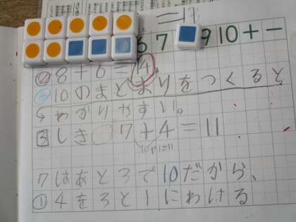 10/13 1年生 算数 4を3と1にわけるよ 公開日 2022/10/13 更新日 2022/10/13 1年生 算数の授業で、「たし算」を学習しています。7+4のような計算のしかたを、数図ブロックを使ってみんなで考えました。「4を3と1にわける!」数図ブロックを動かしながらつぶやきが広がってきたところで、ノートにやり方を自分のことばでまとめました。すっきりばっちり計算できました!