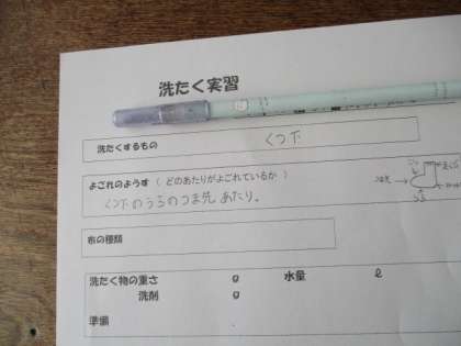 靴下を見直してみると、裏やつま先などが茶色く汚れることがわかってきました。おうちの人にいつも洗ってもらっている子たちがほとんどのようですが、実習が終わったら、自分で洗うようになるとよいですね。