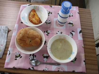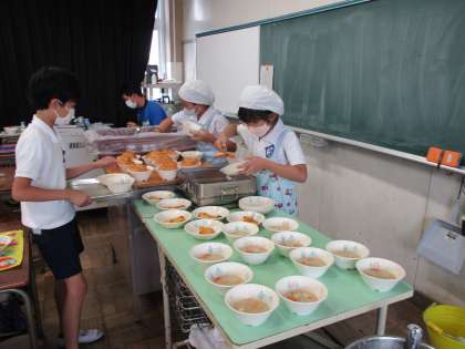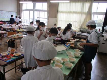 写真は、4年生の給食準備の様子です。3,4時間目に体育祭の児童鑑賞があり、時間があまりない中でしたが、スムーズに準備を進めていました。体を動かしたので、みんな、おなかがぺこぺこだったのか、ぱくぱくとよく食べ、食缶はすっかり空になりました。今日は、甘いりんごパンと、秋の味覚の栗のポタージュが人気でした。