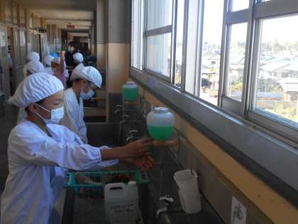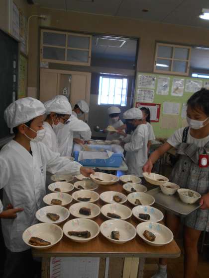 写真は、3年生の給食準備の様子です。4時間目が終わると、すぐにエプロンを身に付けて手洗いをしっかりとして準備に取りかかっていました。給食を教室に運び、食缶のふたを開けると煮物のいい匂いがしてきました。思わず、「今日の給食、何だっけ?」と、声が出てしまうでした。今日は、秋の味覚がたくさん!おいしい給食、「いただきます!」