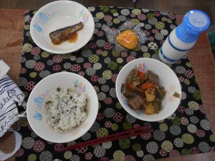 給食の時間が始まりました。今日の献立は、わかめごはん、牛乳、秋野菜の含め煮、さんまのみぞれ煮、柿です。