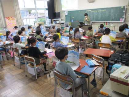 国語の授業で、「くじらぐも」のお話を学習しています。今日は音読をみんなで一緒に行いました。みんなで出し合った「くじらぐもにのって空を旅する子どもたちの気持ち」をもとに、どうやって読んだらいいかを考えながら音読しました。