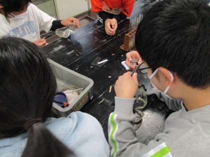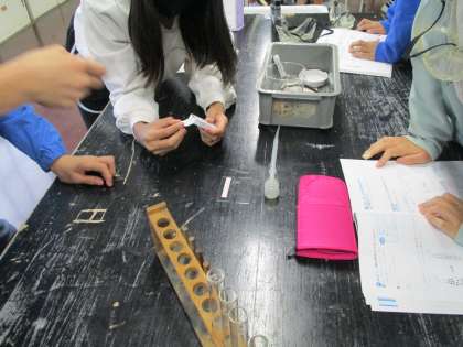 理科の水溶液の性質の実験を行いました。それぞれの水溶液が何性なのかをリトマス紙をつかって調べました。かくはん棒を使い、リトマス紙に水溶液を垂らして、色の変化を観察しました。リトマス紙が赤色から青色に変わると、「すごい!!」と感嘆の声が上がっていました。