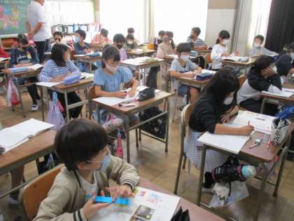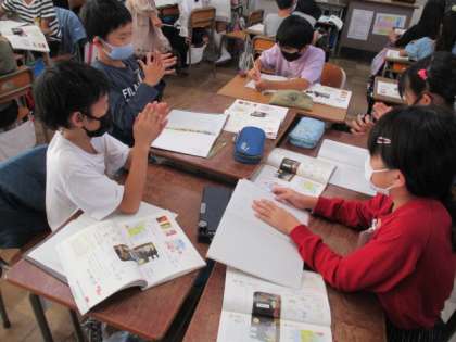 国語の授業で、「秋の楽しみ」を学習しています。今日は、知っている秋の行事をグループで出し合いました。お月見や七五三、もみじがりなど、日本各所で行われているものから、チンドン祭りなどこの地域特有のお祭りなどが出されました。今月末に行われる神山秋祭りも出されました。その中から、「秋の楽しみ」を自分で1つ選んで、誰かに紹介するお手紙を書いていきます。調べると、たくさんの発見がありそうですね。
