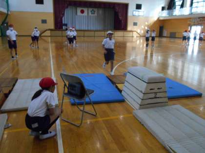 体育で台上前転を学習しています。学習も回数を重ねてきて、とても上達してきました。