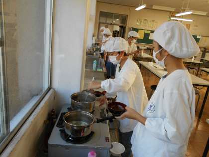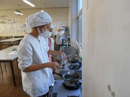 具をを切る、鍋で煮る、みそをとく、という手順を確かめながら、慎重に取り組んでいました。できあがったら、それぞれ、試食をします。できたての温かいみそ汁を、とてもおいしそうに試食していました。また、大根やねぎの切り方や大きさはいいか、具が柔らかく煮えているか、味はどうか、など、食べながらポイントを振り返ることができました。