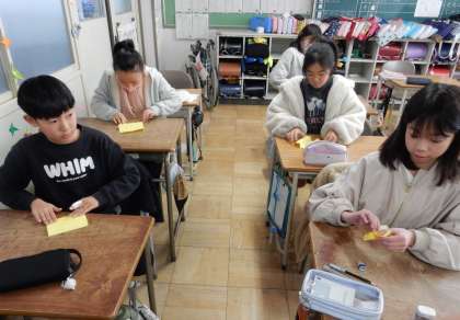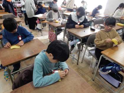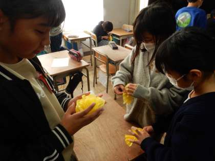 卒業や入学をお祝いするための花飾りを作りました。きれいな花に仕上がるように、花紙の折り方やひだの開き方を工夫しました。思いを込めて作った花飾りは、一層輝きを増して、学校を彩ってくれますね。