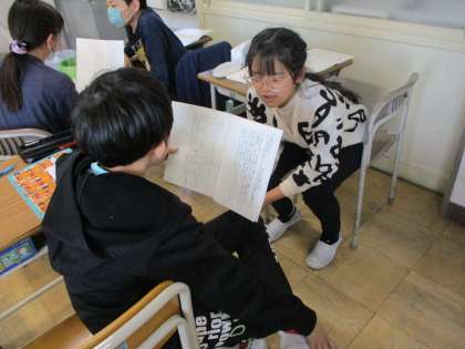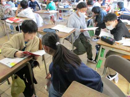 今日の国語では、好きな食べ物を比喩表現を使ったり特徴を捉えたりして文章に書きました。そして、出来上がった文章を読み合い、その人が何が好きなのかを当て合いました。意外と特徴や比喩表現だけでは食べ物が特定できず、苦しみながらも楽しんでいました。
