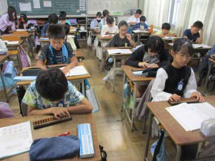 算数でそろばんの授業を行いました。そろばんで小数の表し方を学習し、位をしっかり確認して、計算しました。友達に教えてもらいながら、そろばんのよさを体感することができました。