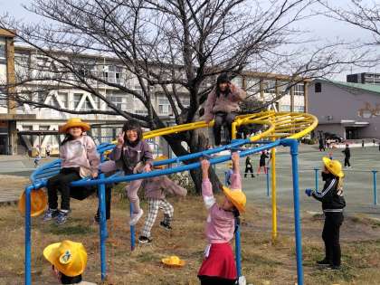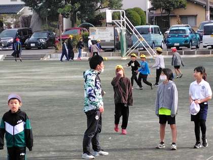 風がないのでそれほど寒くなく、多くの子どもと先生が運動場で元気に遊んでいます。先生と一緒に鬼ごっこをしている子がたくさんいます。一緒に遊んでくれた先生のことは一生は忘れないと思います。運動場で遊ぶことを楽しみに学校に来ている子もたくさんいます。昼放課はペアなわとびです。