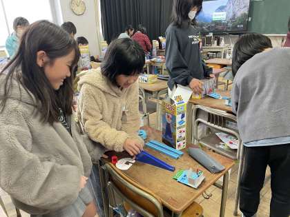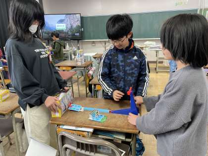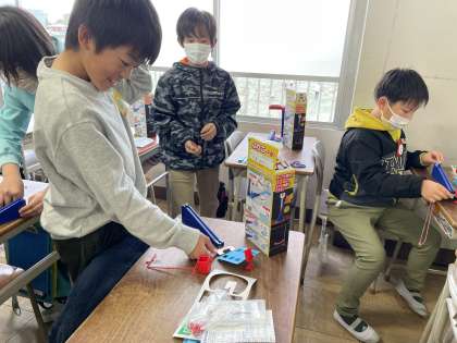 理科の授業で使ったふりこの実験道具で、サッカーのようなものを組み立てたり、的入れのようなものを作ったりして遊びました。いくつかの遊び方があるので、お家で遊んでみてもいいですね。