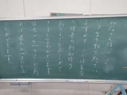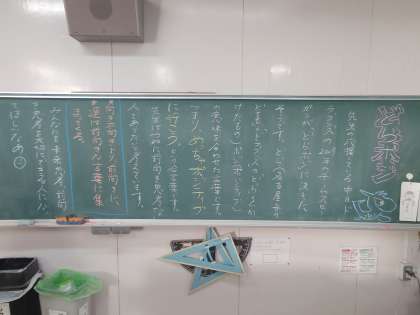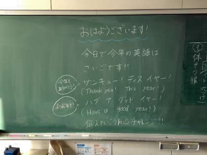 12/17 今朝の黒板「Thant you! This year!」 公開日 2024/12/17 更新日 2024/12/17 神山っ子 日記 今朝の黒板メッセージの一部です。 今朝の黒板には、「サンキュー ディス イヤー!」「どらポジ!」「ノミは約60倍飛ぶ」など子どもたちと一緒に考えたいことが記入されていました。意識させることで、生活の仕方が変わり学級がまとまることがあります。 今週も心温まるメッセージを読ませてもらうことが楽しみです。