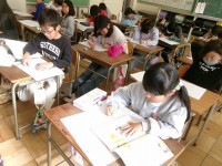 図画工作の時間です。家にあった空き箱や牛乳パック、ゴムなどを使って、カラフルな楽器を作っています。音を鳴らすだけでなく、糸やテープなどで飾りつけもしています。素敵な楽器がいっぱいできていました。