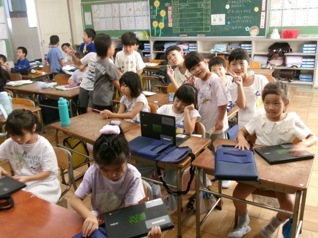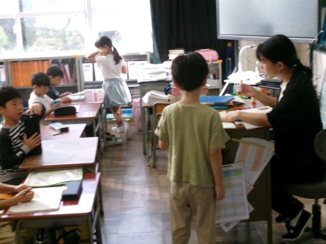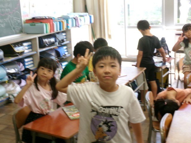今朝の1年生教室のようすです。毎朝、先生が教室内の気温を下げるために冷房をいれたり、子どもたちが教室に入ってくる表情を確認しています。「おはよう~」と声をかけると多く子が笑顔を返してくれます。8時30分の暑さ指数は24.1、気温28.0度と随分過ごしやすくなってきました。連休は身体を休めて、来週も元気に登校してくださいね。※下記の3枚目の写真の「+」をクリックすると、それ以外の笑顔が見られます。