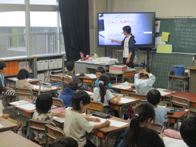 1年生もパソコンでまとめたことをみんなの前で発表しています。