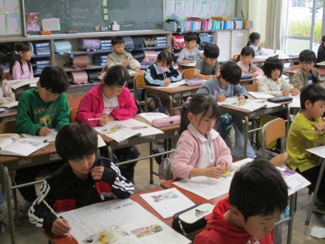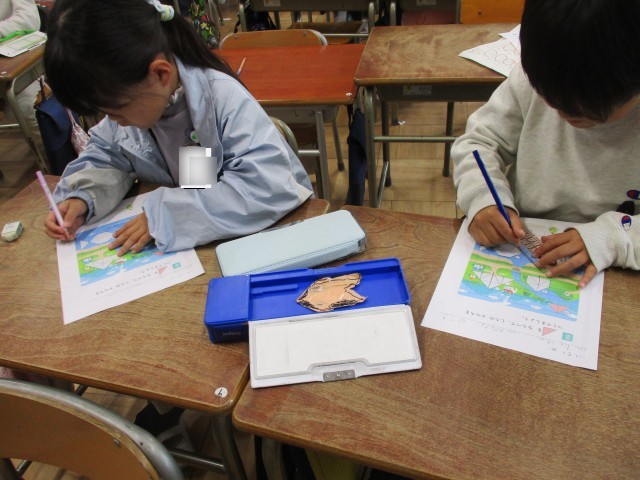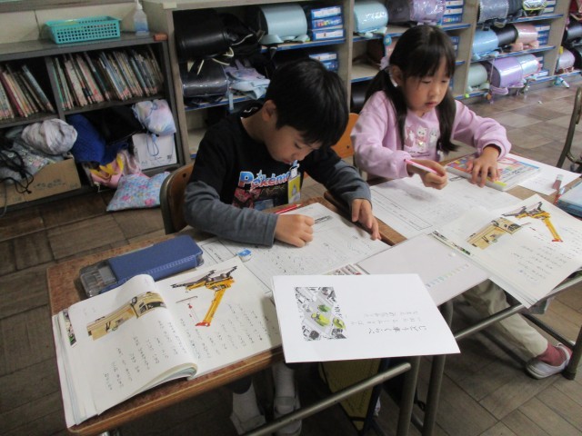 国語で「じどう車くらべ」を読んでいます。今日は、どんなことが書かれているかを考えながら読みました。ワークシートに一生懸命まとめている様子です。