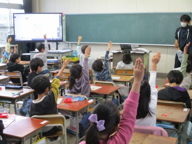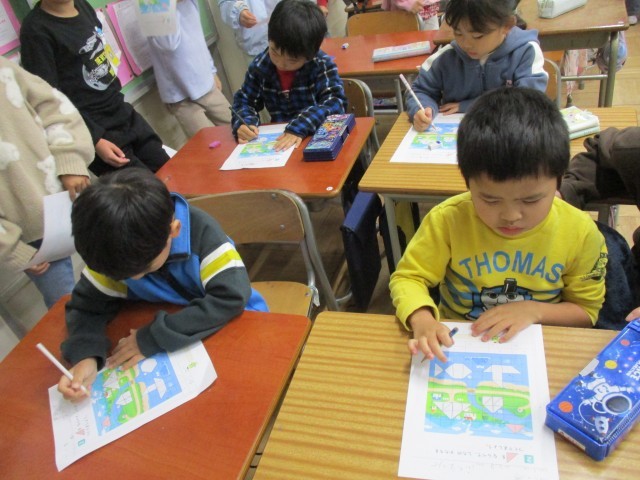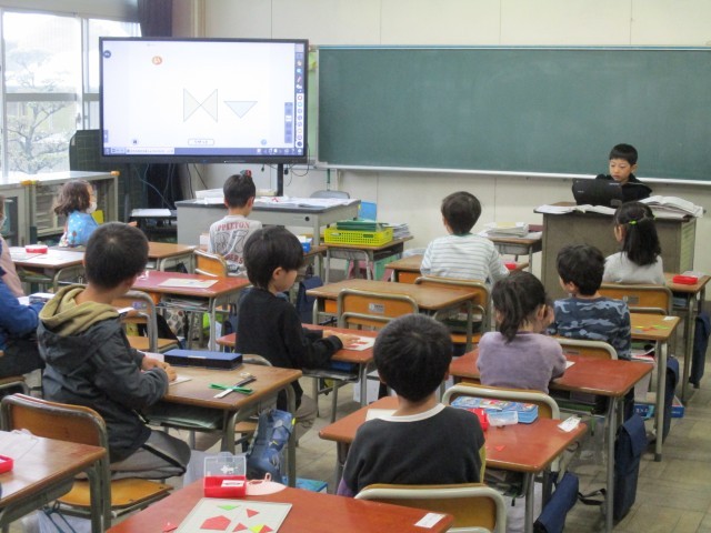 三角形の色板を使って、かたちづくりの学習をしています。「どのように動かすと、この形になるのかな。」という問いに一生懸命考えることができました。「やっとできた!」「どうしたらいいのかな。」と、教室の中に学びの言葉がたくさんあふれていました。