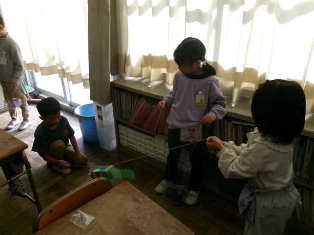 糸をロープウェーのようにするするビューンとうごく工作を作りました。動きから想像して、ロケットや鳥、魚などたのしい作品が生まれました。友達と糸の高さを変えながら、するするビューンと動かして楽しみました。